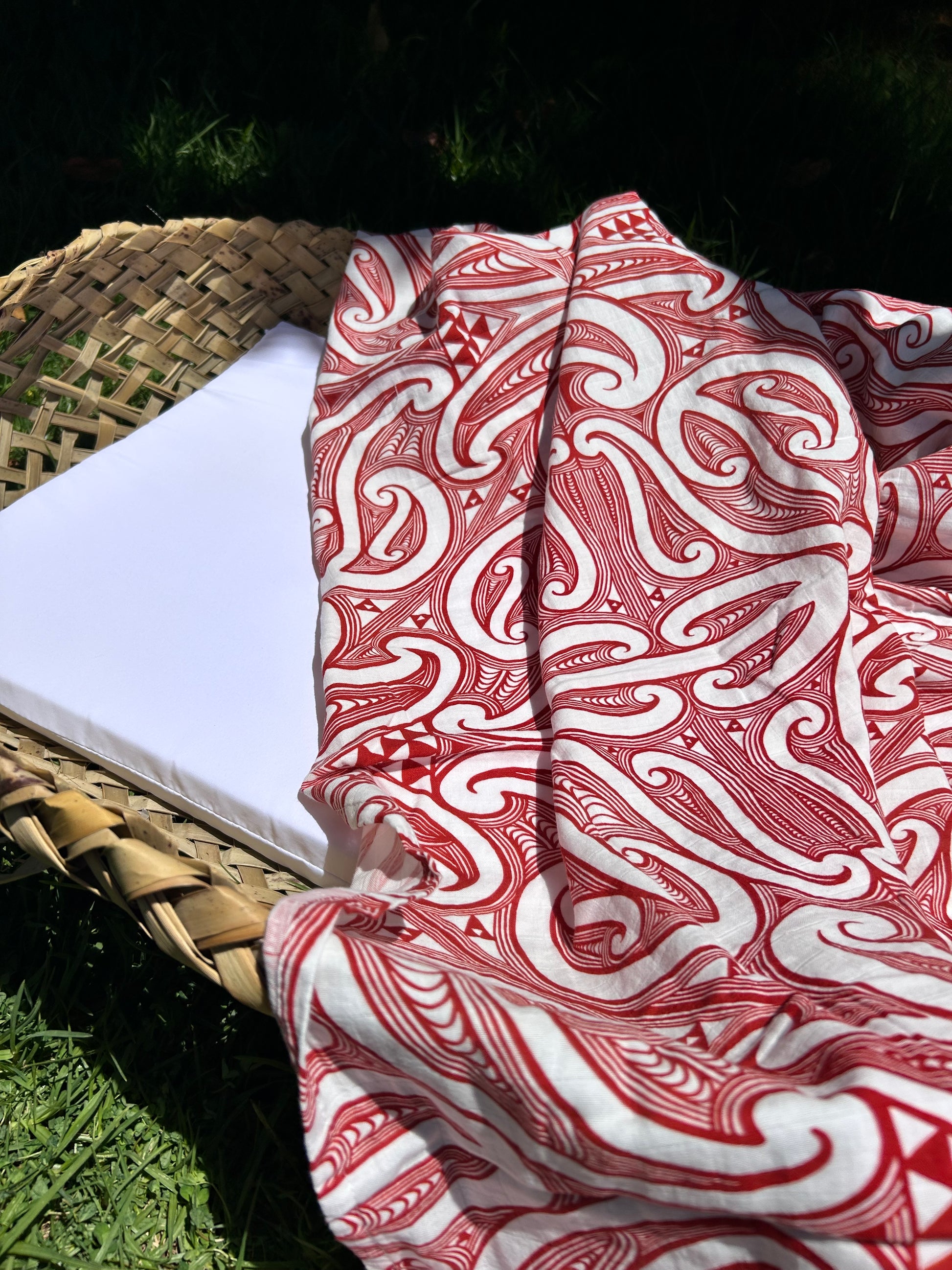 Re-Introducing brand-new Whero Swaddle, featuring a clean white base with bold whero kōwhaiwhai patterns; strong, modern, and timeless.